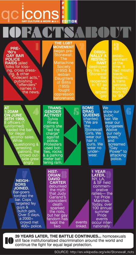 In commemoration of its 39th anniversary, QCicons starts off with a bang with the Stonewall Riots, a 5-day long clash between gay bar patrons and NYC police that brought long-simmering homophobic tensions boiling over onto the world stage. Enjoy the 10 facts above then learn more by clicking on the links below…