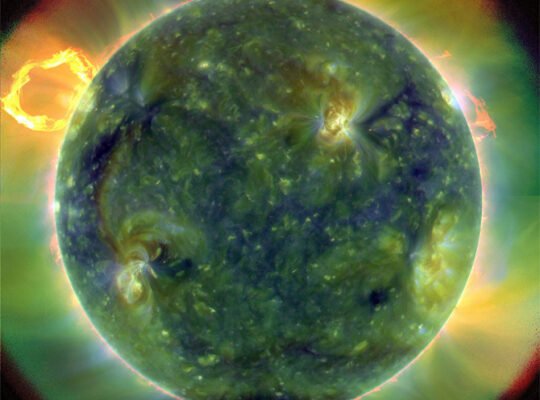This full-disk multiwavelength extreme ultraviolet image of the sun was taken by the SDO on March 30. The false colors denote different gas temperatures. Reds are relatively cool (at least in terms of the sun) at about 60,000 Kelvin, or 107,540 degrees Fahrenheit, while the blues and greens are hotter, at more than 1 million Kelvin, or 1,799,540 degrees Fahrenheit.