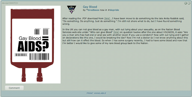 In the UK you can not give blood as a gay man, with out lying about your sexuality, as on the Nation Blood Services web-site under “Who can give Blood” [link] on question twelve after the one about HIV/AIDS, it asks “Are you a man who has had oral or anal sex with another (even if you use a condom)? Now with out lying and I gather on declarations like this one, I would be breaking the law? Now I’m not a doctor so I not know anything about this but still how can it effect the blood. So when I has some surgery recently, I had to have some blood and now that I’m better I would like to give some of my rare blood group back to the Nation.