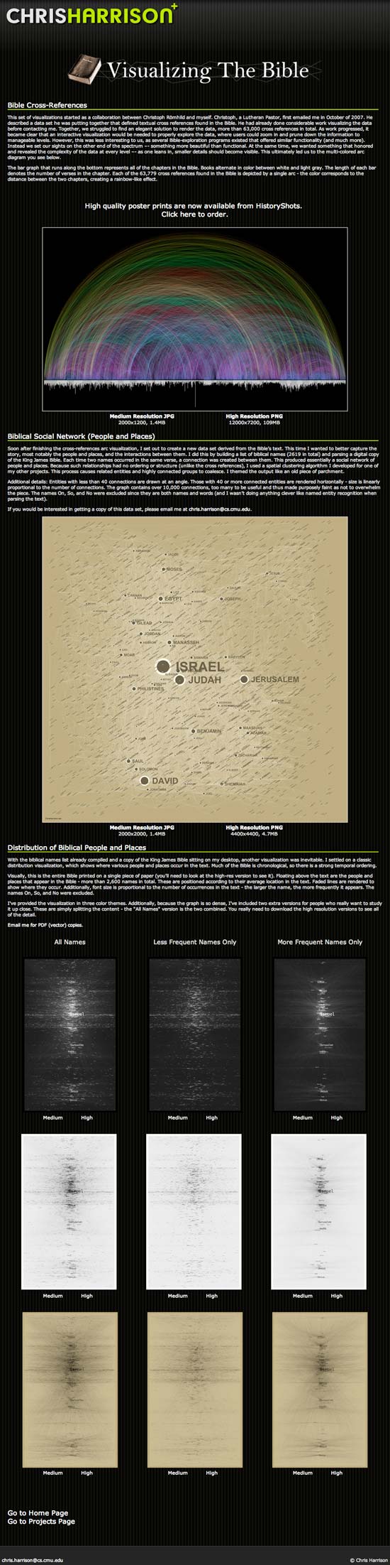 This set of visualizations started as a collaboration between Christoph Römhild and myself. Christoph, a Lutheran Pastor, first emailed me in October of 2007. He described a data set he was putting together that defined textual cross references found in the Bible. He had already done considerable work visualizing the data before contacting me. Together, we struggled to find an elegant solution to render the data, more than 63,000 cross references in total. As work progressed, it became clear that an interactive visualization would be needed to properly explore the data, where users could zoom in and prune down the information to manageable levels. However, this was less interesting to us, as several Bible-exploration programs existed that offered similar functionality (and much more). Instead we set our sights on the other end of the spectrum –- something more beautiful than functional. At the same time, we wanted something that honored and revealed the complexity of the data at every level –- as one leans in, smaller details should become visible. This ultimately led us to the multi-colored arc diagram you see below.