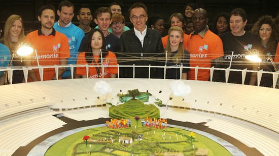 Olympic opening ceremont artistic director Danny Boyle stands behind the model Credit: LOCOG