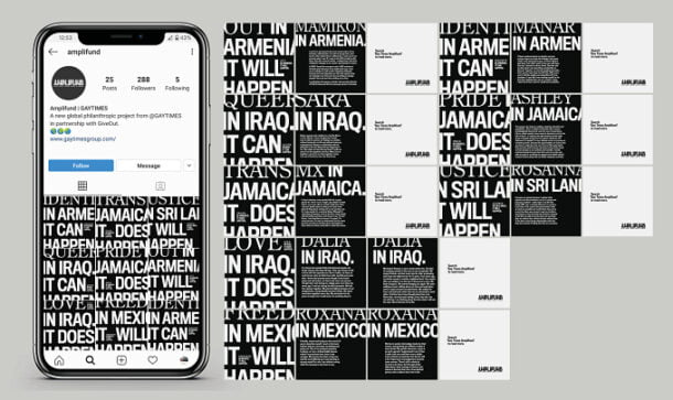 In the second half of 2020, creative team Ryan and Emma from Grey London worked on a stunning campaign for the Gay Times, a charitable initiative named Amplifund. The initiative supported queer media outlets in countries where it’s illegal or dangerous to be LGBTQ+, and uses typographic storytelling to tell the stories of the people affected. The initiative was obviously a great success and it included online and print adverts.